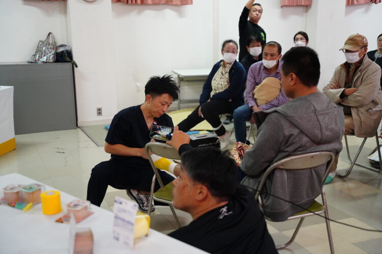 代表的なスポーツ障害である、「オスグッドシュラッター病」や「シーバー病」の概要から治療法、予防法に関する内容をお話しさせて頂き、突発的な怪我である「手の指の突き指」や「足首の捻挫」について応急処置としてテーピング処置を紹介させて頂き、保護者様とみんなで一緒に実技をする時間も設けました。
